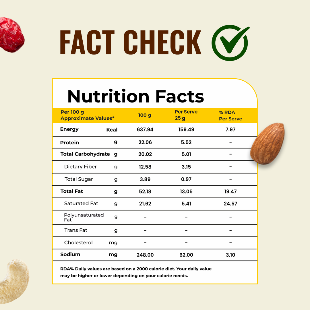 Every handful delivers buttery cashews, crunchy almonds, and luxe pistachios balanced with naturally sweet cranberries, blueberries, and black raisins. It’s that perfect harmony of crunch, chew, and royalty-approved flavor.