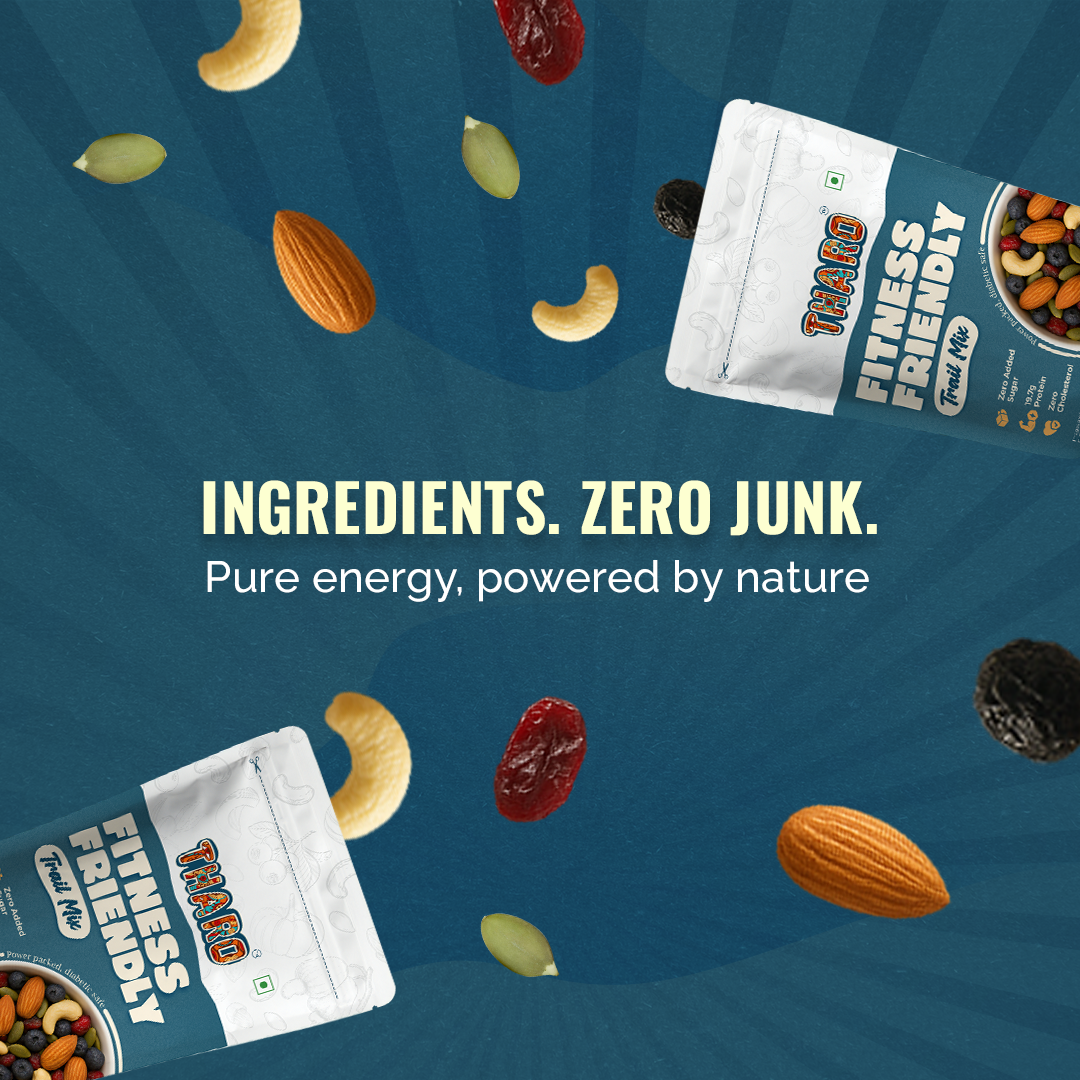 Tharo’s Fitness Friendly Trail Mix fuels your day with a crunchy combo of nuts, seeds & berries — zero added sugar, zero cholesterol, and 100% good energy. Snack it, pack it, or gym-bag it — your power-up is now portable.